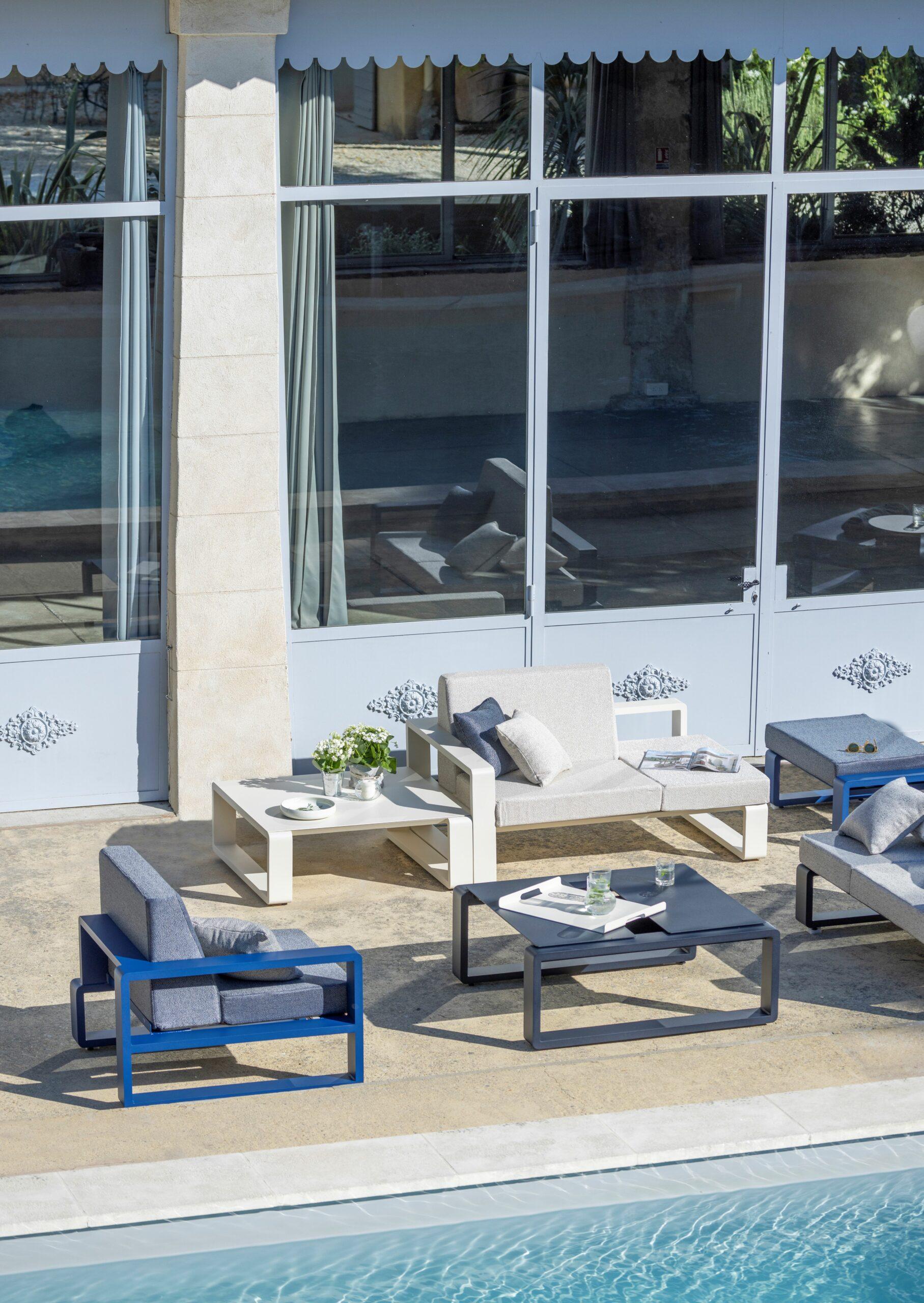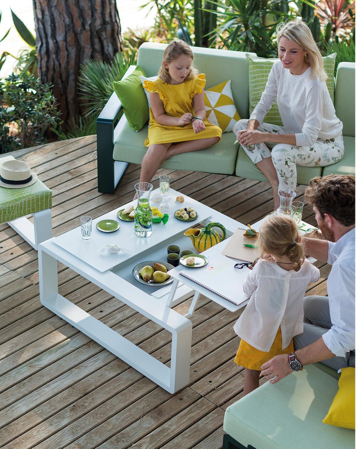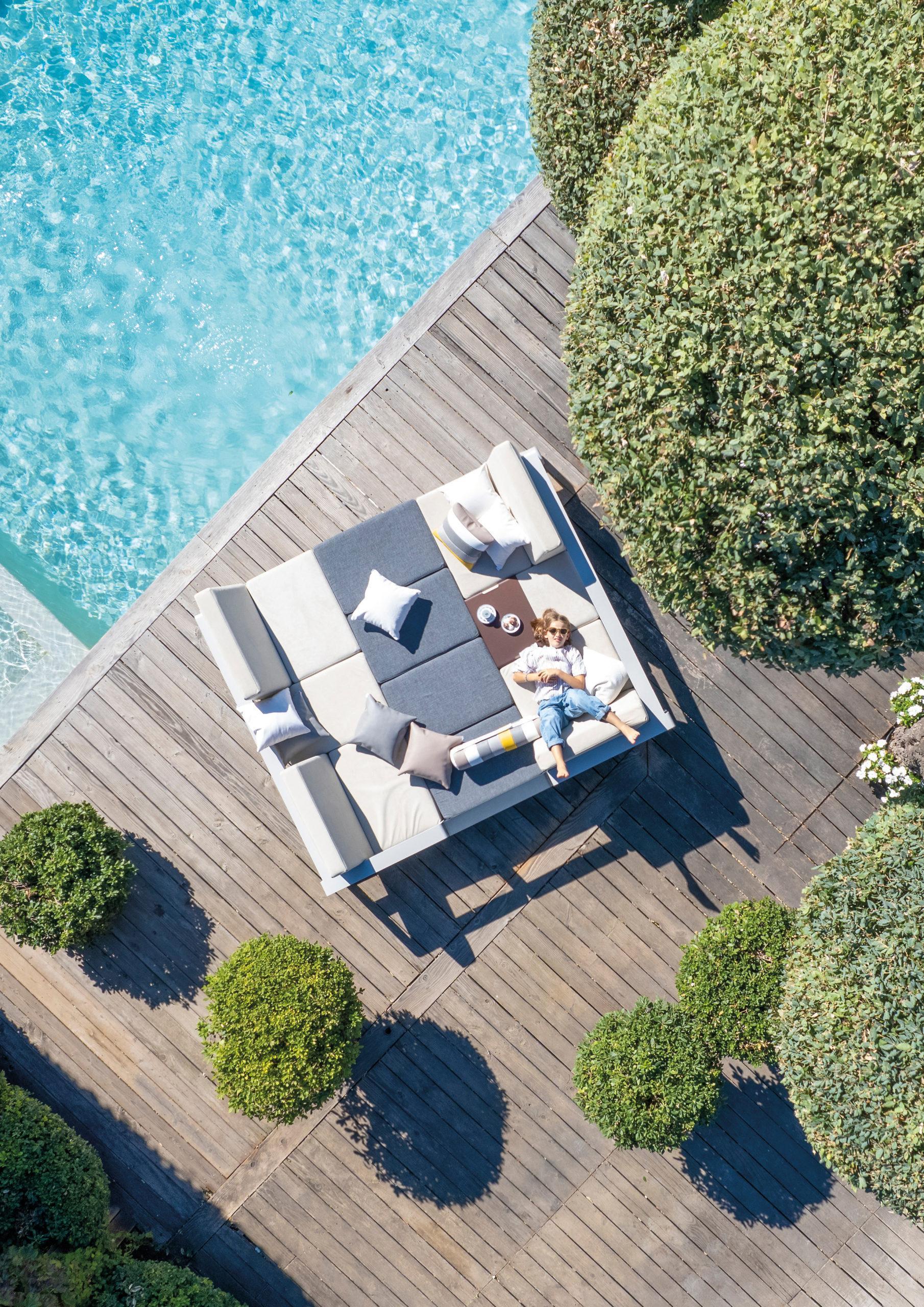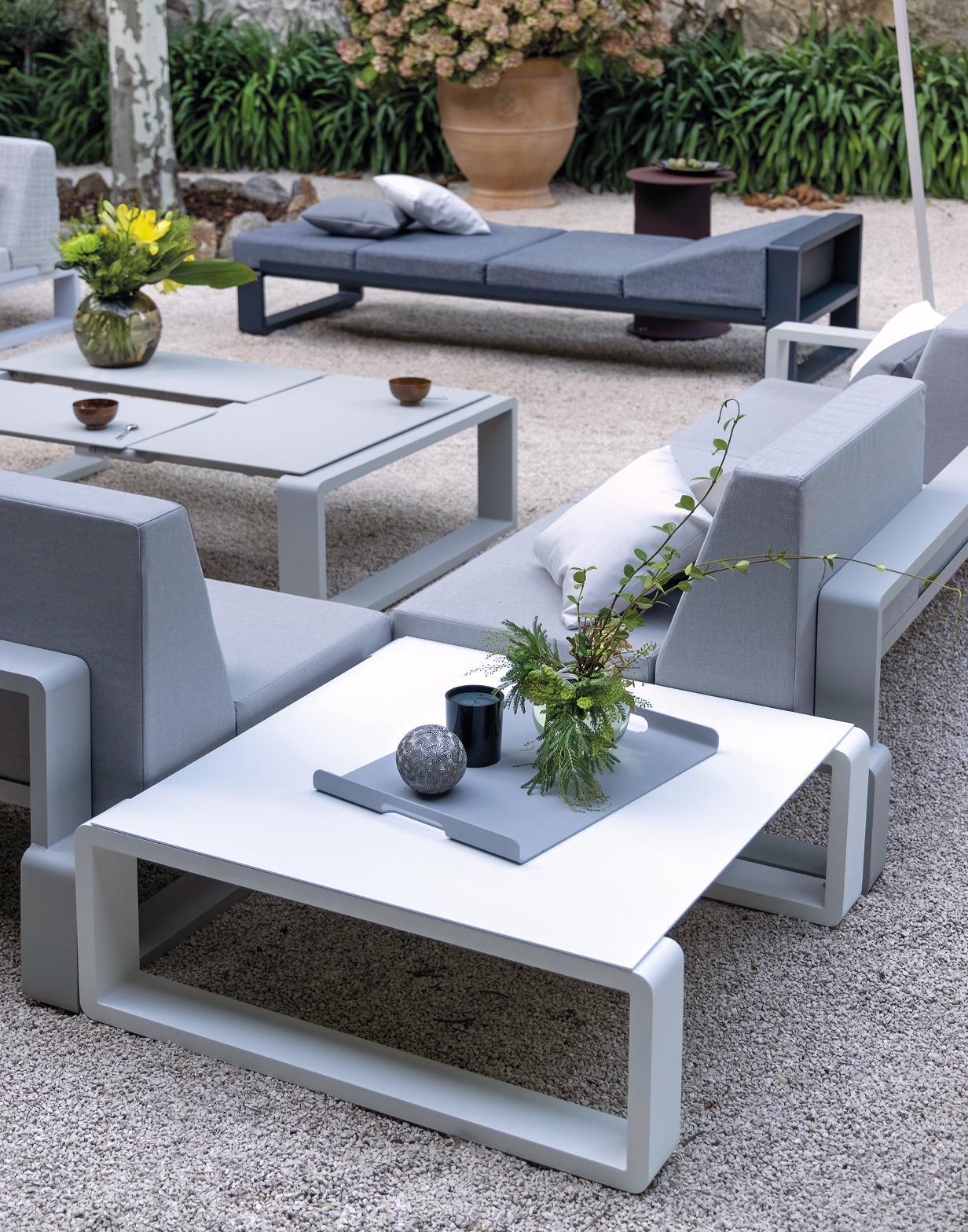 Concept de coussinage revisité, tables modulables avec plateaux ergonomiques réglables en hauteur. Une approche novatrice, ludique et modulaire du meuble d'exterieur.