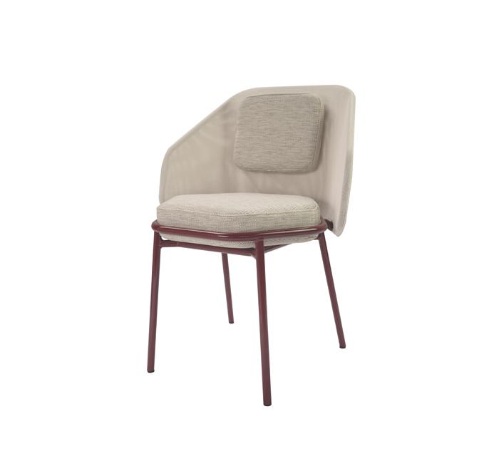 La chaise est composée d’une structure en aluminium laqué qui sertie un épais coussin d’assise. Le dossier est en toile Batyline tendue agrémenté d’un coussin. Sa structure en aluminium souple apporte le confort.